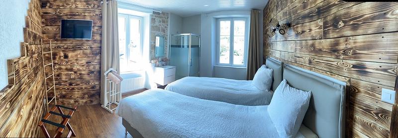 Chambre avec 2 lits simples (90*200), TV à écran plat, lavabo et douche. Les toilettes se trouvent à l’étage.